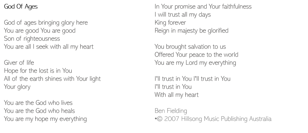 On one specific morning, I had got myself ready and dressed, waiting for my dad to take me and brother to school. I picked up my electric guitar. (it was my first, a black Ibanez GIO). I cannot remember the exact circumstances of the time, but I was certainly feeling frustrations from disappointment and anxiety of the future. I started to strum some chords and eventually found myself singing out Hillsong’s God of Ages, found on their Saviour King album.